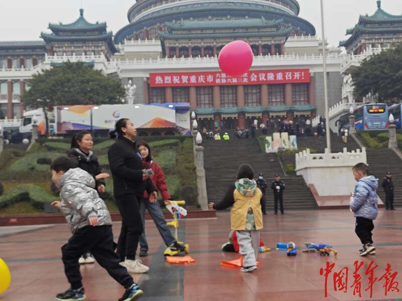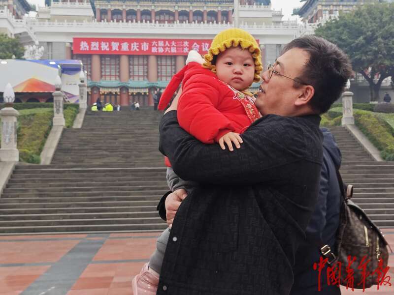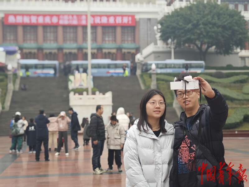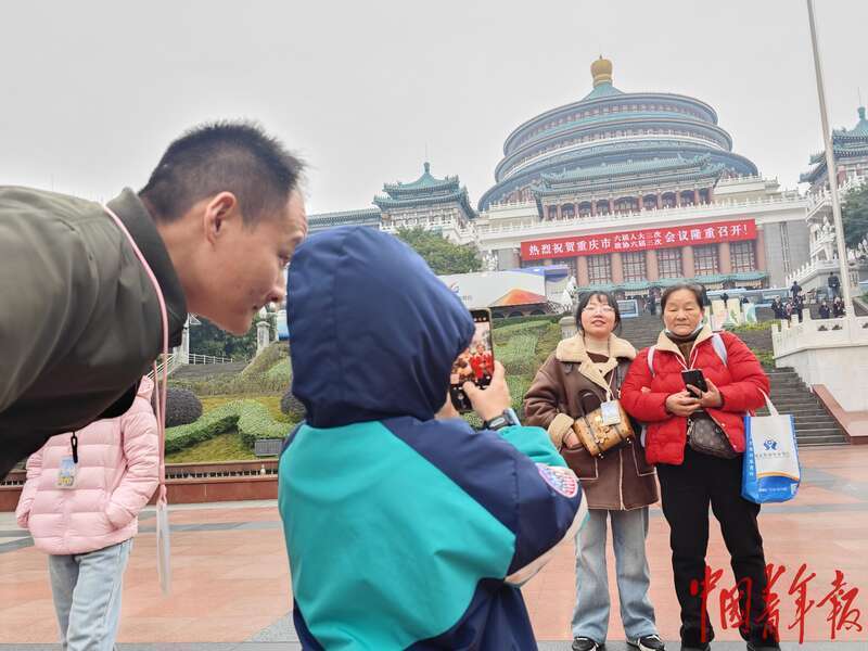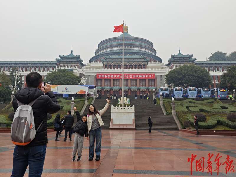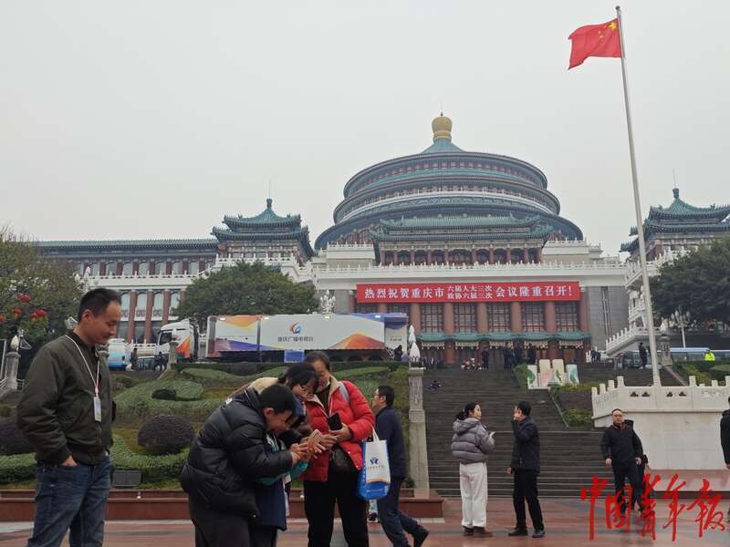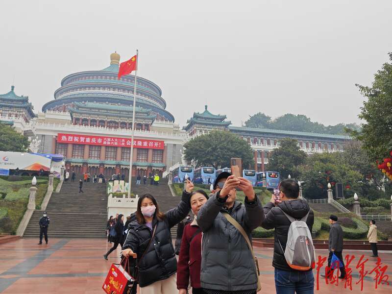 重庆两会开幕之际,会场外的广场上,市民、游客络绎不绝。不少游客“打卡”别具特色的重庆市人民大礼堂,拍照记录和谐、温馨一幕。